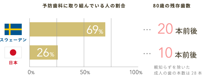 それに対してスウェーデンでは、歯を失う主な原因である歯周病や虫歯をしっかり予防することにより、いつまでも歯の健康を維持し続けているのです。